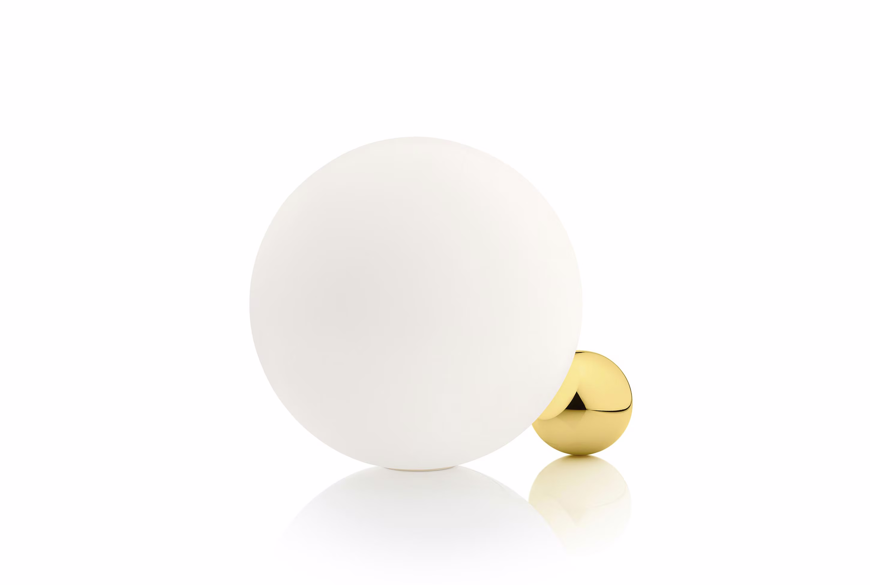 Two spheres in conversation. Copycat pairs a large blown glass sphere with a smaller metal one that supports it. It captures a moment of delicate balance and connection, glowing with a soft, diffused light that highlights the relationship between the two forms.